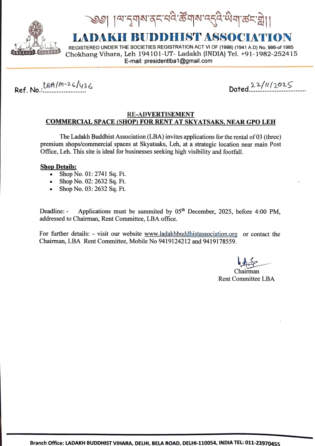 Notice for shop rental space near Riglam school Choglamsar