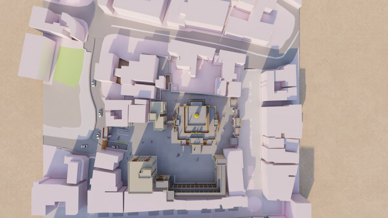 5. Basement level for services and parking, with the basement roof serving as a podium for religious events.